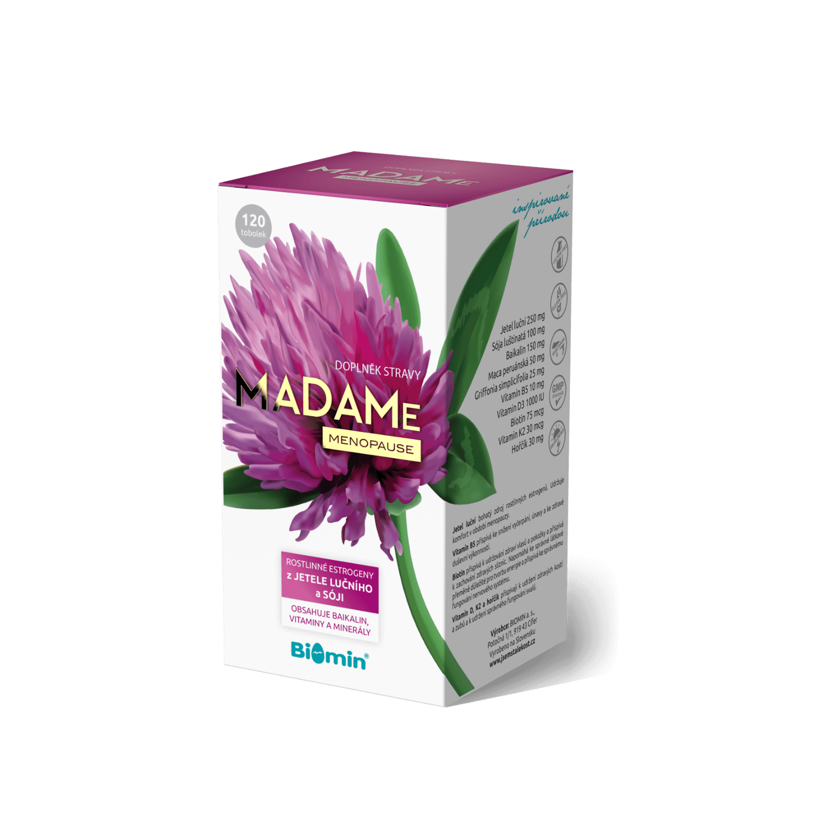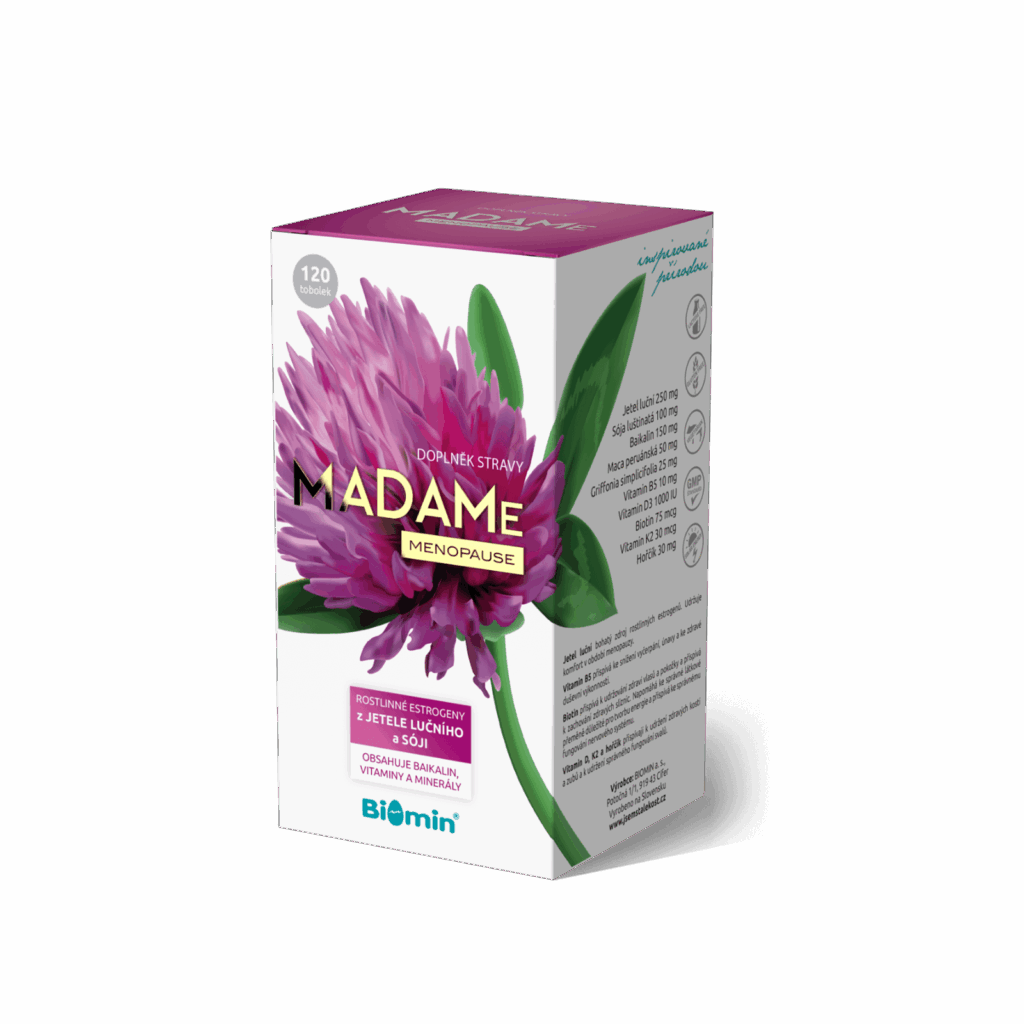 Jedinečnost doplňku stravy MADAMe Menopause spočívá v jeho komplexním složení. Jako jeden z mála doplňků stravy dostupných na našem trhu obsahuje 10 pečlivě vybraných složek, jejichž účinky byly předmětem vědeckých studií. Obsahuje až dva zdroje fytoestrogenů z jetele i sóji, vyváženou kombinaci rostlinných extraktů, vitaminů a minerálních prvků, které mají harmonizační účinek na ženský organismus a mohou být nápomocny při zvládání celé řady nepříjemných příznaků spojených s perimenopauzou, menopauzou nebo postmenopauzou.