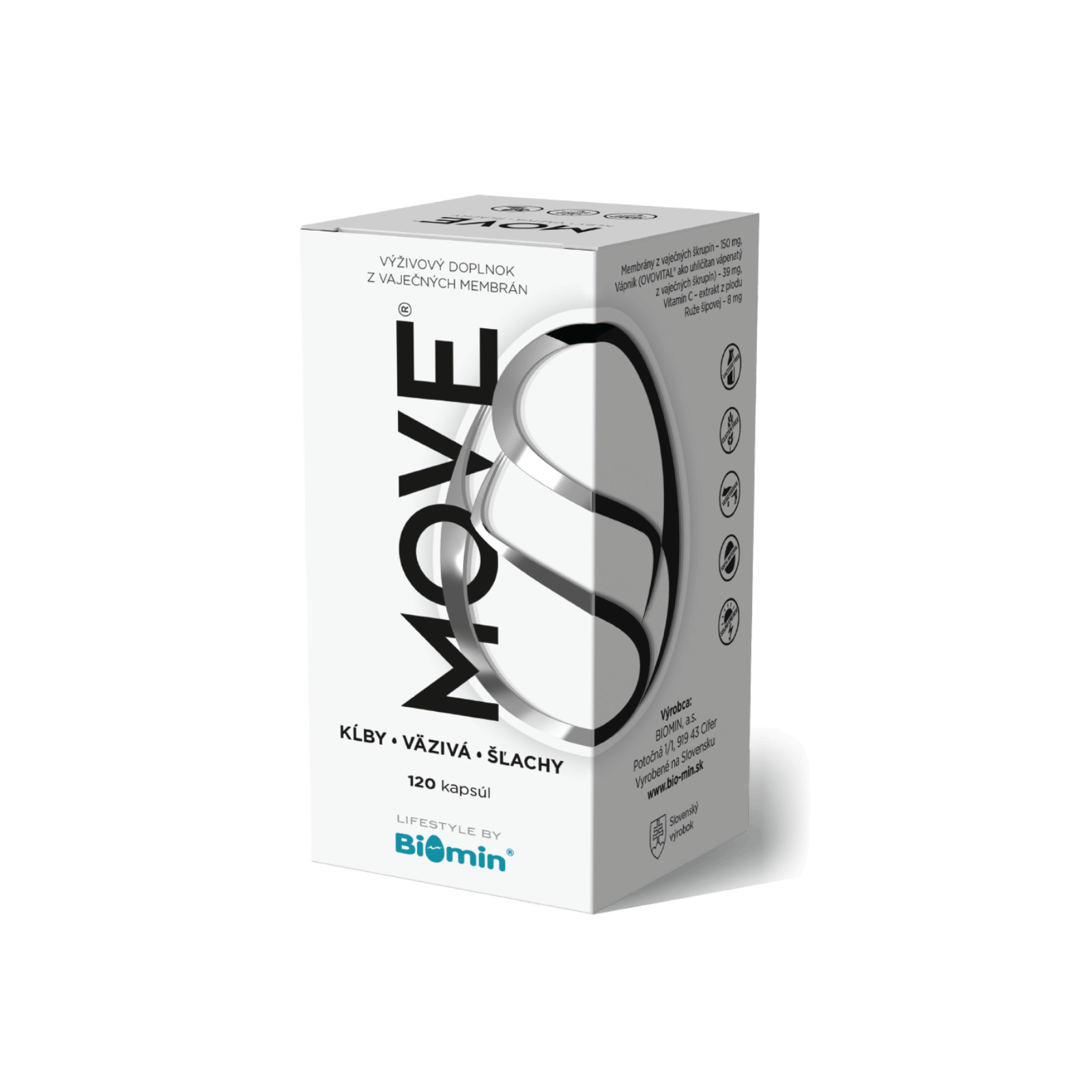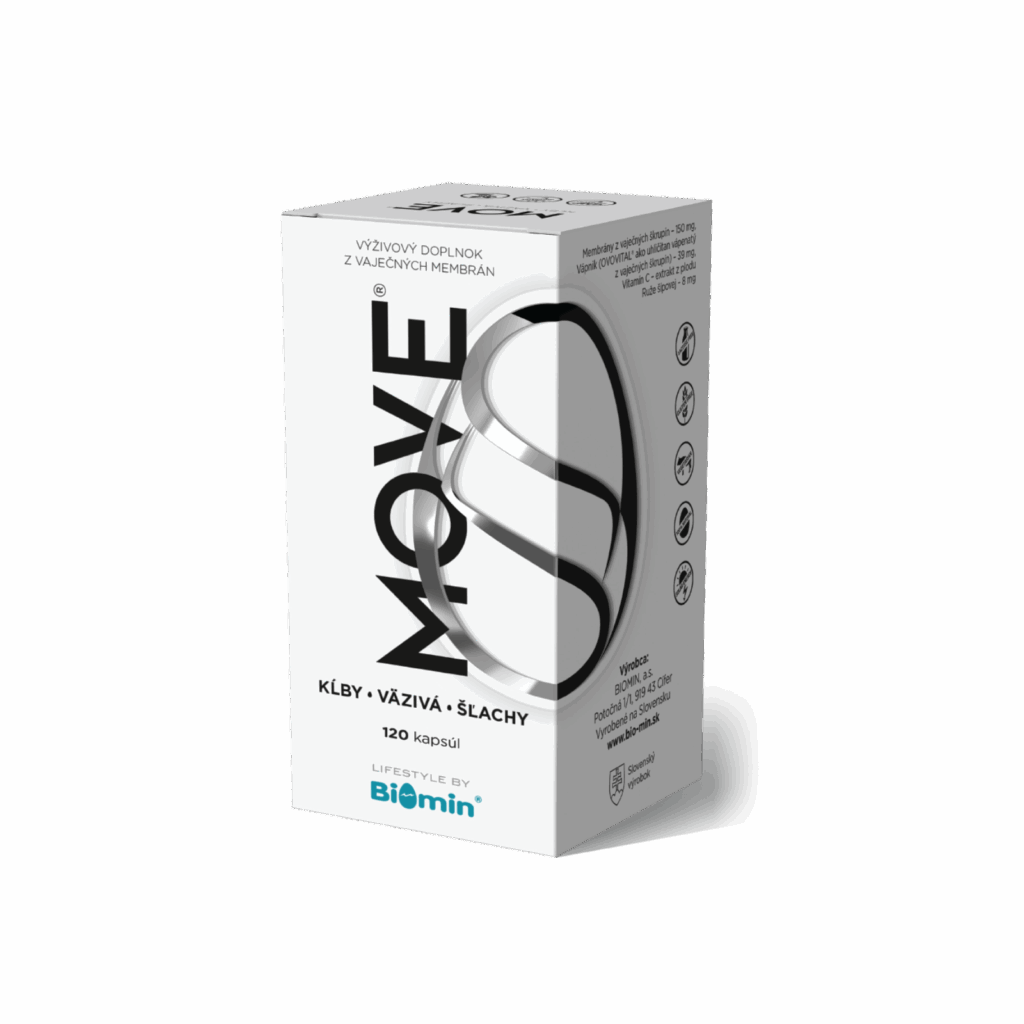Chcete si užívat bezbolestný pohyb a zároveň mít zdravější pleť a krásnější vlasy? MOVE dokáže obojí. MOVE je účinný a jedinečný doplněk biologické výživy pro zdraví kloubů, vazů, šlach, pokožky a vlasů. Obsahuje membrány vaječných skořápek, které jsou známé svými pozitivními účinky na zdraví kostí, šlach a kloubů. Obsahují látky nezbytné pro jejich výživu, jako jsou tři typy kolagenu, elastin a kyselina hyaluronová. Ty potřebují nejen naše klouby a vazy, ale také pokožka a vlasy. Blány z vaječných skořápek zlepšují vzhled pokožky obličeje, zejména v oblasti vějířovitých vrásek, a zlepšují vzhled a kvalitu vlasů – jejich hustotu, lámavost a růst. Výhodou membrán z vaječných skořápek je synergický účinek velkého množství přirozeně se vyskytujících biomolekul. Obsahují více než 300 složek, jejichž účinky se vzájemně posilují a navíc blokují působení enzymů, které rozkládají kolagen a kyselinu hyaluronovou.